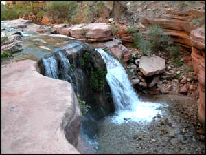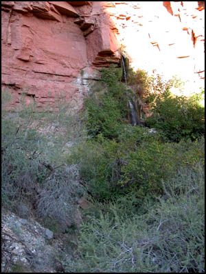 We sleep in late this morning. It feels good not to have to travel today. After breakfast, we decide to walk down through the Narrows and on to the Colorado River. The pictures in all the websites we visited show the Narrows to be a very unique place. We will only be carrying our cameras and water, so this should be a fun day. It is only a half-mile or so until you reach the beginning of the Narrows where a small waterfall cascades down.