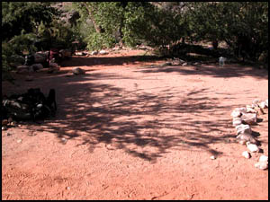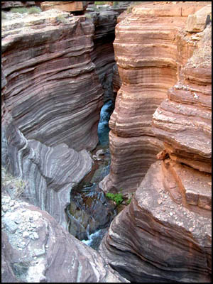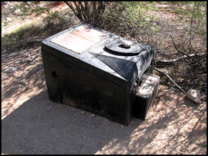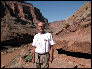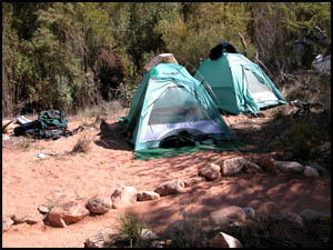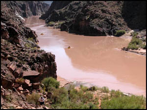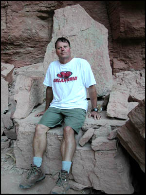 On my return trip to the top, I come to the spot where I made the stupid trail choice. I now notice that there is a small row of rocks placed at a right angle on top of the trail just before the dirt area. Obviously this was put there to warn hikers not to proceed. How in the world did I not see that earlier!!! I make another promise to myself to be more observant in the future. The rest of my trip to the top is uneventful and I meet Art at the Narrows. After hearing my story, he reminds me of the saying in Bob Ribokas' trip report that he too read. It's odd that he thought of the same phrase that I did. We return to camp and have lunch. Art discovers that he has left his sunglasses somewhere in the Narrows, but he is not going back after them. The Park Service has placed a strange porta-potty near the main campsite. I guess it is better than going in the bushes, but not by much. Like Upper Tapeats, there are no metal boxes for food storage here either. The other hikers are getting ready to leave, so we discuss whether to move to the better campsite. Concerned about the difficulty of the hike tomorrow, we decide instead to go up to Deer Spring for the night when it cools down some.