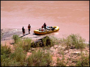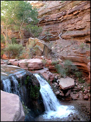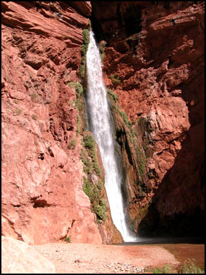 I head down the trail, which is initially fairly easy walking. It makes a few turns and switchbacks and then comes to an area of solid rock next to a 45 degree dirt slope. There is a faint trail out on the dirt, but that looks down right dangerous. I look around, but don't see any alternative to the dirt trail to get down to the falls. In what has to be one of the most foolish moves I have ever made in my life, I creep out along the dirt trail clinging to anything I can get my hands on to keep from slipping. One false move here would result in a few bounces and then a fall hundreds of feet. After I am out on the dirt trail too far and too scared to turn back, I see a girl coming up the correct trail below me and realize what has happened. I am giving a lot of thought to the phrase that Bob Ribokas used in his Nankoweap trip report about "Being at Peace with your Maker." I am definitely hyperventilating more now than I was with the deer encounter getting out to the trailhead. I make a solemn promise to myself that if I survive this, I am never going to allow anything like this to happen to me again. I am now on all fours sitting down and actually sliding down this incline until I finally reach safety. No words I can write could express the utter fear I was experiencing. The trail is easy walking now that I am on the correct one. I get to the bottom and take pictures of Deer Creek Falls and some rafters. The falls are spectacular.