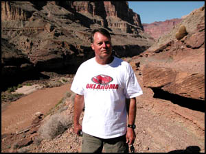 We walk on and in just a few minutes we reach the end of the Narrows, which is a cliff that is several hundred feet above the Colorado River. The River is a dirty, brown color. On several of my hikes, it has been a very pretty, green color. We take turns getting each other's picture. Art is just too tired to continue on the steep trail down to Deer Creek Falls. We agree to meet back in the Narrows when I am through visiting the falls.