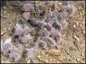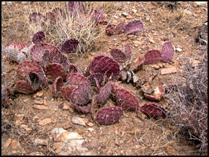 Many of the rocks, blackbrush, and cactus in this area have a strange purple