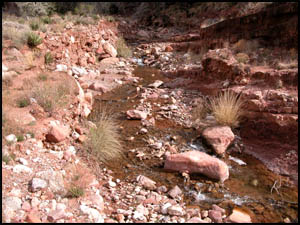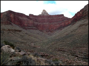 I know a day hike to Cheyava Falls is out of the question, but I was hoping to at least explore the Obi Canyon ruins. Just then black clouds roll in, the temperature immediately drops several degrees, the wind picks up abruptly, and the snow begins. I guess that major front the Ranger talked about is arriving. Since I am here alone, I think prudence dictates that I pack up and head back to Phantom Ranch. I would hate to get snowed in here. I eventually leave about 11:15. The strong, gusty winds make the initial climb out quite exciting, unlike the calm, sunny descent yesterday afternoon. I am quite relieved to get above the red dirt section and onto the easier rocky sections.