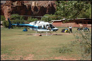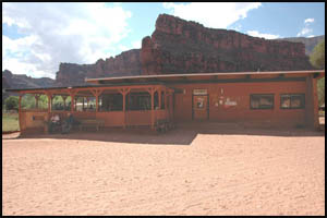 One of the first buildings in the Village is the Tourist Office, where we pay our entrance and camping fees. Next to it is a field where the helicopter lands with people and gear. We then stop at the cafe for lunch. Beth has the Indian Fry Bread with beef and beans while John and I have a burrito. Both are excellent. After lunch, we buy postcards at the store across the street and mail them at the Post Office so they will get their famous "Mule Train Mail" stamp.
