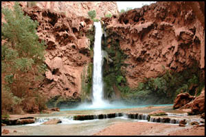 We awake to near disaster. Last night I put Beth's and my food in a mesh, stainless steel Ratsack Cache bag and left it on the picnic table. This morning Beth finds it in the creek barely hanging onto a rock by a sliver. Although wet, we are able to salvage most of our food. Apparently, one of the dogs from the Village came rummaging through our campsite last night and carried it away. We are fortunate our bag was not swept down stream and over the falls, never to be seen again. John also had some of his MREs taken by the dogs. The new boots I used for my North Rim day hikes this summer have been putting blisters on my feet. I now have the largest blister I have ever seen across the entire ball section of my right foot. I use two layers of Moleskin and hope I can endure the discomfort for our day hike. After breakfast, Beth and I check inside John's bivy and find he is gone. He talked yesterday about trying to make it to the Colorado River, so maybe he struck out early today. Beth and I pack our daypacks and head downstream for Beaver Falls. It is only a few hundred yards from the west end of the campground until you reach Mooney Falls. And we thought that Havasu Falls was impressive. This is the tallest falls on the reservation at 196 feet and is named for Daniel Mooney who fell to his death here in 1880.