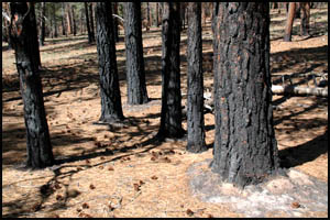that fire has burned much of the ground cover and the bases of the trees,