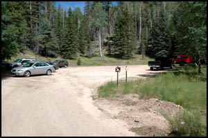 My wife and I did a one hour mule ride this morning, so I'm getting a late start on this hike. To reach the trailhead drive north on Highway 67 just past the North Kaibab Trail parking lot. Turn west at the highway sign onto a nice gravel road and travel seven-tenths of a mile to the parking lot.
