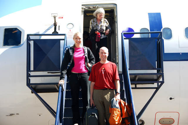 BARBARA, BETH, AND JAMES GETTING OFF THE AIRPLANE IN CUSCO