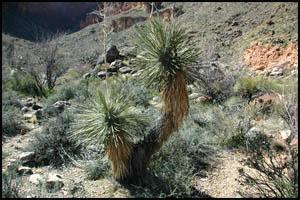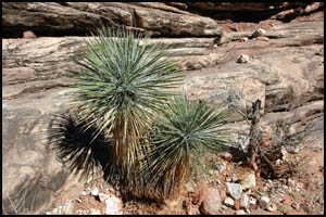We pull into Serpentine Canyon at mid-morning, where we take an extended break with our shoes and socks off. Knowing that the water here causes many people intestinal problems, we carried enough from the rim yesterday to last us all the way to Ruby Canyon. Nearby is a very pretty Schott's Yucca plant.