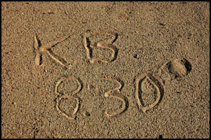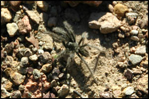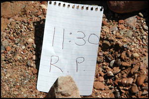 There wasn't much frog croaking last night, so I got lucky. Keith and I discuss our itinerary today. I hurt my right big toenail the first day coming down the South Bass Trail and don't feel like doing a day hike to Boucher Rapids at the end of the day. Since Keith has not seen the rapids and he is a much stronger hiker than I am, we agree that he will leave here early ahead of me, drop his pack when he reaches Boucher Creek, do a day hike down to the rapids, and then meet me back at our new campsite at Boucher Creek. He leaves Slate Creek a few minutes before 8:00. I eventually leave around 8:20. Right away I find a Tarantula crossing the trail. Then I find a note from Keith in the sand as to when he passed this point.
