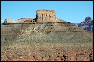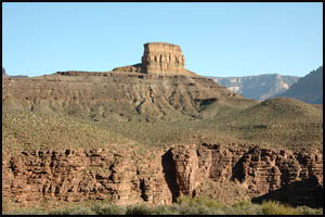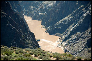 In about two hours, I get my first view of the Colorado River today. It's still flowing a muddy, brown color. I am now on the east side of Marsh Butte and will soon reach the point where the trail starts a rapid descent into Topaz Canyon. That section looked quite steep when my daughter and I were camped at Boucher Creek in 2005.