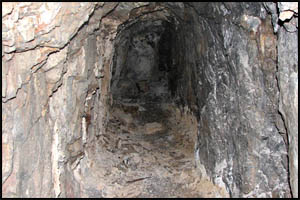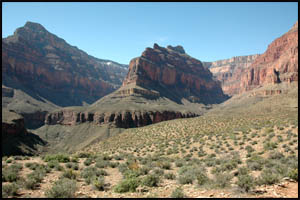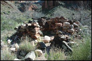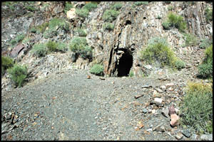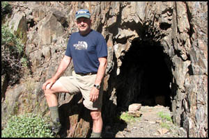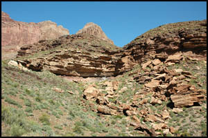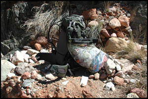 I reach the campsites at Boucher Creek around noon. The best campsite where my daughter and I camped a few years ago is already taken. Bummer. I sit down and talk a while with the guys who are camped here. In just a few minutes, Keith arrives and we look around for our own campsite. There is another pretty good site next to the other guys, so we put our stuff down there. It is blistering hot, so we decide to wait until later to set up our tents. About all you can do now is look for some boulders to hunker down beside in the shade. Around 2:30 the guy leading the group I met earlier going up toward Marsh Butte comes into camp with a medical emergency. It seems one of the guys in his group is having a heat stroke or heat exhaustion just east of Marsh Butte. Fortunately, we have our satellite phone. After several calls to the Park Service and a few dropped calls by the satellites, we convince the Park Service to send a rescue helicopter. While we wait for the chopper, Keith and I go over to explore Louis Boucher's mine. It is only about fifty feet long, so apparently Boucher found it more profitable to mine the tourists than look for copper.