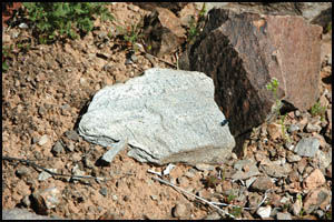 This descent is brutal. It clearly is the toughest descent we've had on the entire hike. Near the base of the descent are a lot of rocks with some kind of silver, reflective material embedded in the rock. It is almost like looking at a mirror. This picture does not do justice to the reflective nature of the rock. At the bottom, I find Keith's pack on the other side of Boucher Creek and leave him a note showing when I arrived here.
