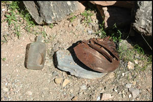 Keith and I find some Boucher artifacts in one of the campsites and return those to the cabin. One is the head to a shovel and the other is an intact liquor bottle.