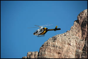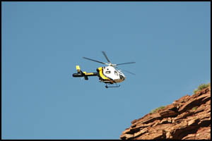 In just a little while, the rescue helicopter flies overhead toward the east side of Marsh Butte, lands, and turns off his engine. In another half-hour, they finish loading the victim on board, start up, and fly back to the rim.