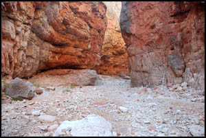 The bed of Jumpup Canyon is gravel, cobblestones, and small boulders, which