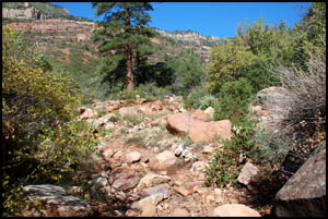 As we descend this part of the trail to the creek bed, Tom points out that this gray section of rock is really part of the Redwall. Its gray color is normal but not often seen. Most Redwalls have a layer of the Supai above it and it is this Supai layer that stains the Redwall with its red color. For some reason, this part of the trail has no other layers above it. Tom's knowledge of Canyon geology is impressive.