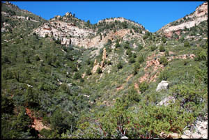 We leave around 7:00 this morning. There is a little boulder hopping in the bed of White Creek until we reach the base of the Redwall. Going up the Redwall with its steep, loose sections is much easier than it was going down. At the top, the trail has a few ups and downs and then loops around to the west for a mile or so before starting downhill again.