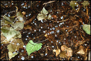 As I descend the switchbacks, the sky again looks quite threatening. The rain starts just as I pull into the Cottonwood trees. A thunderstorm has stalled overhead with a lot of lightning and thunder. I have always heard that refuge under trees is not wise when there is lightning nearby, but these trees are the only place to offer some protection from the rain and hail that is now pelting me.