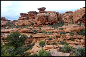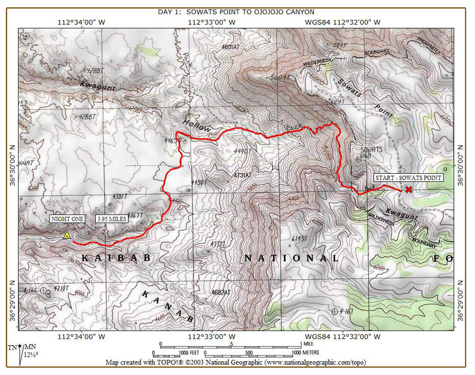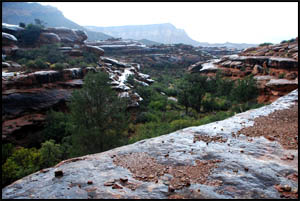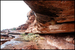 I reach a point too far west to be able to descend into Ojojojo Canyon due to its steep sides, so I have to backtrack to the east. I wait out another rain shower under an overhang. I'm finally able to start down into the north arm of the canyon. I was expecting the going to be easier, but it is quite a bit of bush whacking and boulder hopping. The problem is that there is lots of water flowing in the creek. That prevents me from going straight down the creek bed, forcing me to alternate from one side of the creek to the other, trying to find the best line down. After another two hours of very slow progress, I check my GPS to see where I am. I placed several waypoints to assist me in determining my position including one for my intended campsite. Unfortunately, I expected to be a lot farther along than I am. There is simply no way I can reach my planned campsite tonight, which will also prevent me from reaching Racetrack Knoll tomorrow. Rain is again falling, so I think the better course of action is to head back uphill and look for a campsite and then hike on out tomorrow.