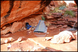 There really are no good places to camp in Ojojojo Canyon and I'm not looking forward to spending the night in the open without my tent when there is probably going to be more rain. I then see an overhang near a pour-off that has one flat spot several inches above the water line. That spot will just accommodate my tent. Since we have already had so much rain today, I'm hoping the water flow will not increase any during the night even if we get more rain.