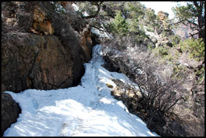 I meet a group headed downhill who tell me that there is some snow at the top, but crampons are not needed. Pretty soon I reach the snow and proceed very cautiously across it. The group was right, so that saved me from having to dig my Microspikes out of my pack.