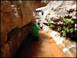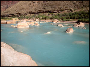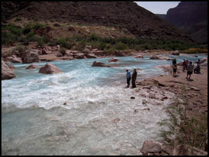 across the Little Colorado. Several people float downstream in the Little Colorado. Unlike the