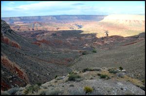 I am up at 5:30, pack my gear, and skip breakfast. I say goodbye to Keith and Bob and head up the trail at 6:15. My plan is to do the steep uphill switchbacks while it's still cool. In just over an hour, I reach the top of the switchbacks. That's a relief. It's nice to be looking down on the cottonwood trees. I make my way around on the mostly level trail and notice a gold-like deposit on the side of the rocks. Maybe I should file a mining claim. There aren't many blooming flowers this time of year.