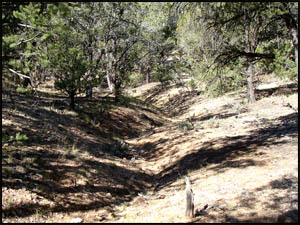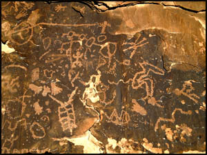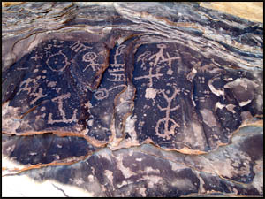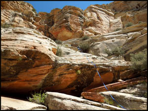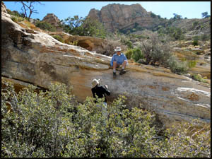 Just to the north of the Rabbit Hole are an amazing number of Petroglyphs on both the wall and floor. The rock floor slants at about a thirty degree angle, so it's a little uncomfortable walking on it while taking pictures. Click here for a short video clip of the Petroglyphs. We descend below the Petroglyphs and make our way to the south to a point just above the Moqui Steps. These are indentations carved in the rocks to form a crude series of steps. This feature is much steeper than these pictures make it seem, so I brought 75' of one-inch webbing to use as a hand line. I wrap the webbing three times around the base of a large bush, tie three half-hitches, and then work my way down to the base of the Steps. Jonathan does not think much of my knots and reties them with a bowline knot. OK. I admit it. I flunked out of Boy Scouts. Jonathan then descends to the base of the Steps. Just as Keith is starting down the Steps, a bottle of his Gatorade slips through a tear in the mesh pocket on his pack and careens downward eventually going out of sight. After he reaches the bottom, we decide to leave our webbing here to use on our return in two days. Click here for a short video clip of Jonathan going down the Steps or click here for Keith's video clip.