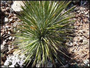 It was cold last night, even with my car camping gear, so we sleep in until around 7:00, pack our stuff, eat, and get away at 8:30. A person who went to the Arch last week reported there was no water at our intended camping spot tonight, so we are each carrying an additional three quarts of water. One of the hard things about the Point Huitzil route is finding the proper descent point at the rim. I plotted our initial course on a topo map and found it to be 307 degrees true. Since the magnetic variation in this area is twelve degrees east, I calculated our indicated magnetic heading will be 295 degrees. I also put in three waypoints in my GPS between here and the rim to help guide us to the initial descent point, a small drainage descending to the northwest. Jonathan will be cross-checking with his compass to make sure I don't get us off course. The terrain is mostly flat as we leave Pasture Wash. A little weaving and bobbing is required to get around the numerous juniper trees. About one-third the way to the rim we come across the old telephone line that used to run down to the Village of Supai. It's been very dry and we only find a few flowers along the way. We then pass my second GPS waypoint and start a gradual uphill climb toward the rim. Just as we reach the third GPS waypoint we come to the small drainage we were expecting to find and begin our descent. We are right on track to reach the correct spot at the rim. At the bottom of this drainage, we turn westerly and follow the creek bed all the way to the edge where we take a break. We then start the steep descent to the base of the rock outcropping shown in the lower center of the far right picture below. At the bottom of a series of small, but steep switchbacks, there is a ledge with a 6-8' drop-down you have to negotiate. While there is a small pile of rocks below the ledge to stand on, they are wobbly and care must be taken here. Click here for a short video clip of Jonathan making his way down. The Rabbit Hole is just on the other side of where Keith is sitting on a slanted ledge. One would not normally look for a way down that close to the edge, but that's where the Rabbit Hole is. There is some mild exposure as you make your way around the far edge and start down a crack in the rocks.
