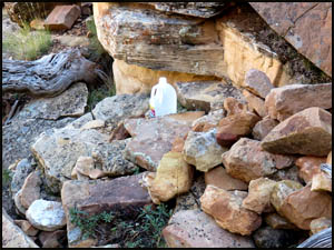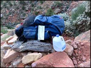 The temperature last night turned out to be very moderate. We leave camp this morning just after 8:00. Part way up we come across an abandoned backpack and an almost full gallon of water. Although we look around extensively, we don't find anyone. The terrain is very steep and difficult here. I sure hope someone didn't fall over the edge. Maybe the hiker was feeling badly, left his pack here, and hiked back up to the top. In about one more hour, we find another full gallon of water. Whoever left that here made no effort to conceal it.