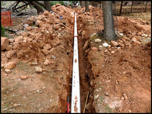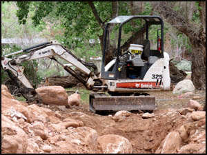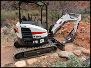 After breakfast in camp, I walk over to the canteen. The Park Service has hired a company to replace the waterline down at Phantom Ranch. The workmen have the day off, so I think I'll check out all their equipment and see what they're doing. They have several excavators down here. I wonder how they got them here.