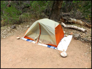 When you are solo, you have the luxury of having a campsite all to yourself. That is nice. I meet Mark and Jodie this afternoon. They had such a good time on their day hike up to the Clear Creek overview that they also did the river loop around the two bridges. We meet again at 5:00 for the steak dinner. Tomorrow morning I've got the 5:30 A.M. breakfast at Phantom Ranch and then it's up to Indian Garden for the night. MAIN INDEX | HIKING INDEX | BACK TO DAY 1 | FORWARD TO DAY 3