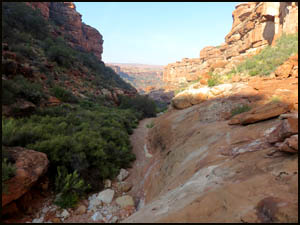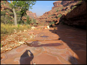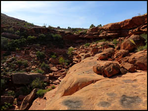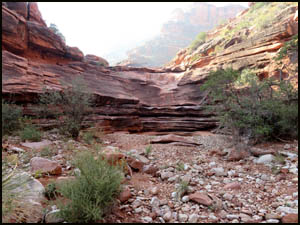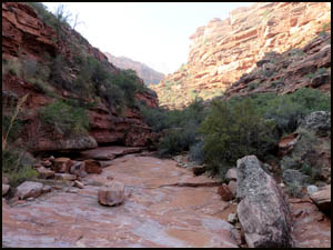 Richard and I start down Indian Hollow headed for the intersection of it and the drainage leading to the Esplanade. On the way, we pass the main arm of Indian Hollow that comes in on our left. We pass several suitable camping spots with water.