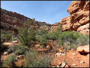 It takes about a half-hour to reach the drainage intersection, which I have marked with a waypoint on my GPS. As we make our way to the top of this side drainage, there are several minor bypasses on the left going uphill (drainage right).