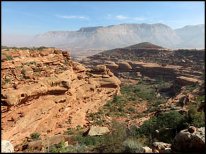 After about an hour, we reach the top of the drainage. An eight foot high cliff wall presents a formidable obstacle to being able to climb out of the drainage and reach the Esplanade. Bob Bordasch, in his trip report when he did this hike solo, indicated he was unable to exit the drainage at this point due to the height of the wall. He was then forced to move several hundred yards to his left. Richard and I help each other with hand and foot holds and are barely able to scale the wall at this point and reach the Esplanade. That saved us a lot of time and effort by not having to find another exit point. However, we're not sure we will be able to get back down at this same point.
