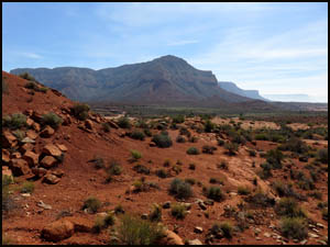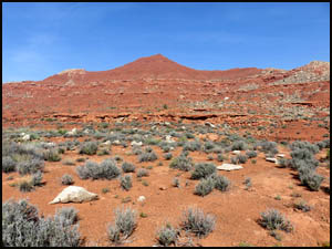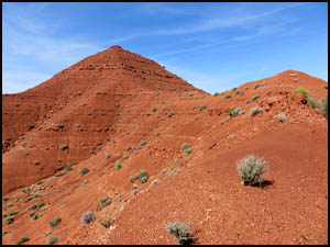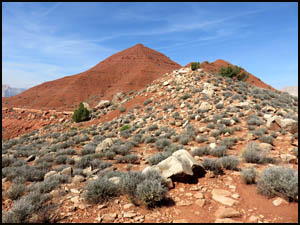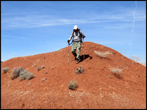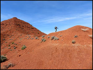 Because it is still a long ways there, we have some time to discuss and analyze the Knoll and decide which side we should start up. We agree that the right or north side appears to be the easier side, so we angle over that way. The first part of the climb involves getting to the top of a white boulder field. Once on top that, we start up the red dirt sections. The last one hundred feet or so involve going up a narrow ridge with an elevation angle of about 45-50 degrees, although the angle seems much steeper than that when you are actually doing it. The steepness of this ridge and the slippery nature of the dirt make this last little climb a harrowing experience. You are constantly afraid that your feet will slip out from under you at any moment, which would result in sure death. The pictures below do not adequately show the steepness of the ridge.
