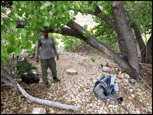 Richard and I are in no hurry to get around this morning since we're only going back over to the cottonwood trees for the night. We walk up Indian Hollow, only to find an impasse point. Hmm, how did we get down here day before yesterday. Both of us seem to have forgotten our exact route in. We finally go down Indian Hollow a short distance to a point where we can climb up on the ledge above. We are then able to walk up canyon to the entry-exit point we used the other day.