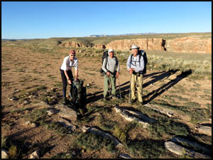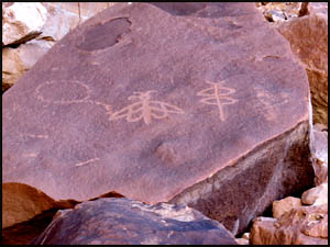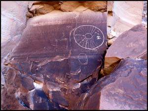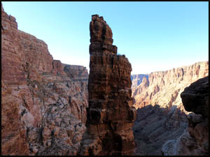 In about a half-hour, we reach a tall rock spire, often referred to as one of the Twin War Gods. Hopi legend says it is one of the two Gods that turned to stone to guide the way to the salt deposits. The other is supposed to be along the Little Colorado River or Colorado River, but we did not see it later in our hike. At its base, I start to go right, but Richard Erbe tells me the Park Service trail description says to go left here. I'm glad he read that as he saved me a lot of work by not scrambling down the wrong direction and then spending a lot of effort backtracking to the spire. In just a little while, we reach some rock art.