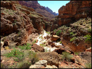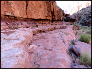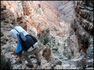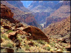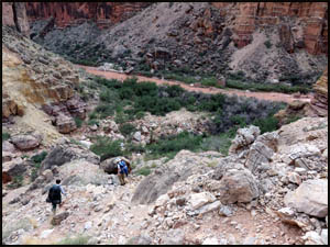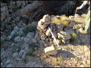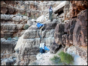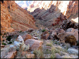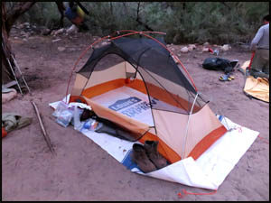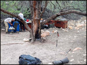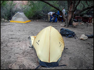 We hike for another three hours on this side of the drainage with some intermittent scrambling along the way. I tell the others I am sorry for slowing them down considerably by taking frequent breaks due to my illness. I haven't been this sick in many years. We finally end up right above the helipad and our camp spot. I struggle to make the steep descent and get to the helipad where I immediately flop down. As the saying goes, I am sicker than a skunk. The others look around for a better place to set up camp. They return for me later and help me into our camp about a hundred yards more upstream from the helipad. There are a lot of supplies and equipment here that are probably used by the various groups working on the Humpback Chub Preservation Project.