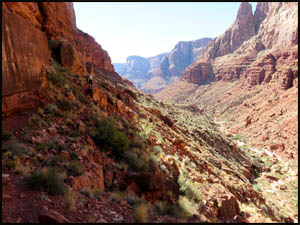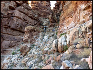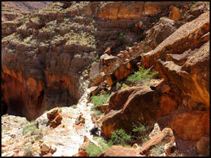 We stand for a few minutes at the trailhead and check out Salt Trail Canyon. It looks like this thing goes downhill in a hurry. There is some mild scrambling and a little hand to toe climbing as we make our way down. One misstep here would not have a good result.