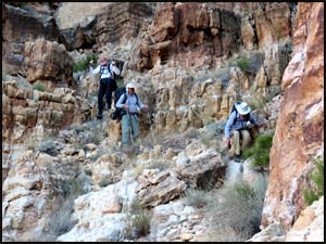 It is enticing to continue down to the creek bed from this ledge, but the correct route is to stay left and remain at this same elevation. For some reason, I am feeling badly all of a sudden. Maybe this cold is worse than I thought. We hike for another hour and a half before taking our lunch break near the creek bed.