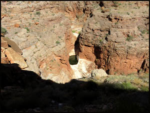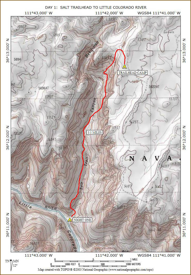 I eventually set up my tent, but have a hard time eating anything. I am now coughing up large amounts of yellow stuff, which Pete White, a doctor from North Dakota, says is a good thing. "How's that" I ask. He explains that means my white blood cells are doing their thing fighting the infection. That's not real comforting since I feel like complete crap. Tomorrow we are proceeding down the Little Colorado River to the Confluence. MAIN INDEX | HIKING INDEX | BACK TO PREFACE | FORWARD TO DAY 2