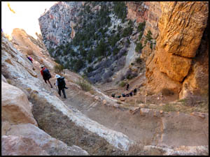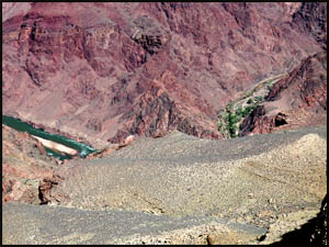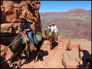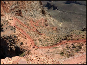 We start the brutal downhill section below Skeleton Point and immediately run into the morning mule riders coming uphill. The view looking down shows just how steep the many switchbacks are below here. We can also see the Phantom Ranch area and the Colorado River flowing a pretty green color. Then we have to wait at the side of the trail for the pack mules to take a rest break.