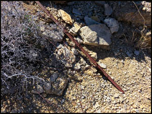 When we get to the bottom of the switchbacks, we start to loop around Natural Arch. Using Google Earth before our trip to check out the Cremation Shortcut, it appears that the ridge line we want to take runs into the regular trail just as the trail turns slightly to the northwest. Sure enough, it is exactly where we expected it to be and is the only ridge line around. We step off the main trail and start walking down the ridge line to the northeast. It is very easy walking. In a few minutes, we find an old T-post and a lot of barbed wire. I can't imagine why anyone would have spent the time and effort to fence off this area. In about twenty minutes, we meet up with the regular trail. When I got home from this trip, I used one of my topo map programs and calculated that the distance from where we left the regular trail to the Tipoff Point toilet is .6 miles if you stayed on the regular trail. It is also .6 miles from that toilet to where we met the trail again. That total distance is about 1.2 miles. I also calculated that we walked about .2 miles on the Cremation Shortcut ridge line, so it looks like we saved about one full mile or around a half-hour by taking the Cremation Shortcut.
