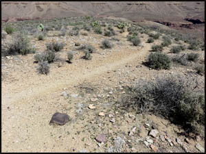 It's a little farther over to the cairns marking the Cremation Use Area boundary than I remembered. The Park Service used to let you camp anywhere east of these cairns. Just past those cairns, we stop at a very nice campsite where I have camped on a prior hike. Richard and I have lunch in the shade of the overhang area. I forgot to take pictures of this campsite, so these pictures below are from a prior hike. This area is now off-limits to camping. For the life of me, I can't figure out why the Park Service now prohibits camping here. In any event, they purposely destroyed the little rock wall shown in the last picture below and made the area unappealing for camping.