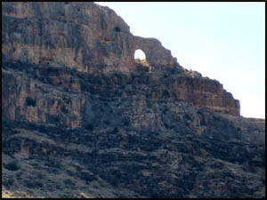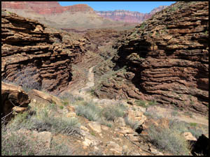 I have always wondered how Natural Arch, which is at the base of the switchbacks below Skeleton Point, got its name. When we look back in that direction, we see a small rock arch on the north side. I have never seen that before during my many trips down the South Kaibab Trail, so it's possible that the trail passes too close to the base to allow seeing the arch while on the regular trail. The middle arm of Cremation Creek is also a steep climb, but not nearly as tough as the west arm. Because we are both pooped, we would like to camp here, but again we do not find a suitable campsite. After climbing out of this drainage, we see our intended campsite not too far away in the east arm of Cremation Creek.