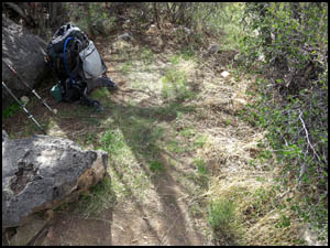 We arrive at Boulder Creek around 3:00 and each set our packs down in an empty campsite. We then walk up the east arm of Boulder to see if the spring is flowing water. Sure enough, the Backcountry Office was correct. The spring is bone dry, so it's a good thing we carried water here.