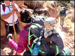 A little farther up the trail we meet a family hiking down. This is the first time I have seen someone bringing a large toy stuffed animal with them. Pete Berry and Ralph Cameron went to great lengths in 1893 to "pave" their trail from Horseshoe Mesa to Grandview Point with stones. They needed this hard surface to accommodate their copper mining on the mesa and to provide an all-weather surface for the numerous mule teams carrying ore up to their mill at Grandview Point. Despite not being maintained for over a century, many of the paved sections of the trail are still in excellent shape.