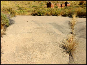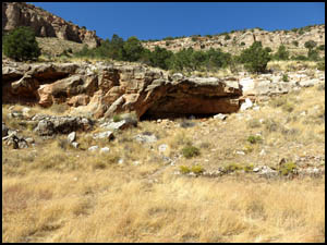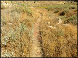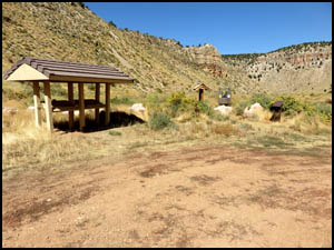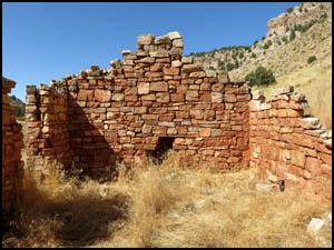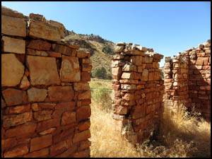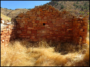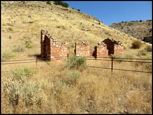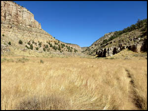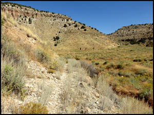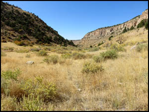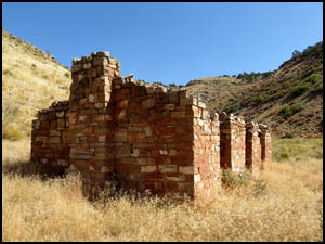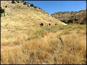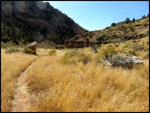 The two informational displays below are under the covered pavilion shown in the first picture above. We leave the trailhead with only day packs. It's nice not to be carrying a forty pound backpack like I usually am. The trail is very distinct, basically flat, and easy walking. In just a short distance, we see an old rock house on the other side of the gulch. Richard decides to stay here while I explore some over at the house. There is a drainage ditch that is a slight challenge to get across in order to reach the house.