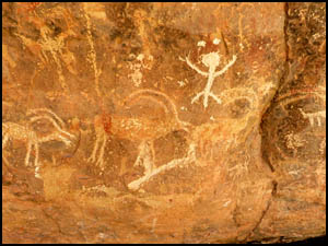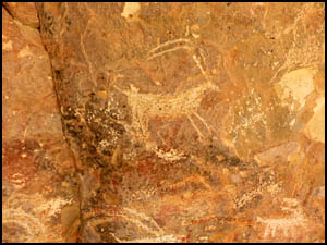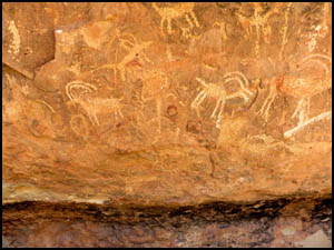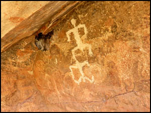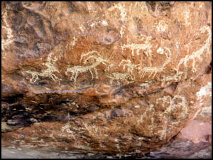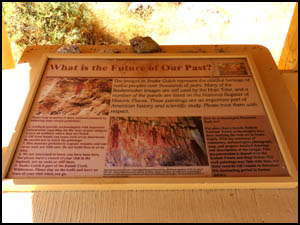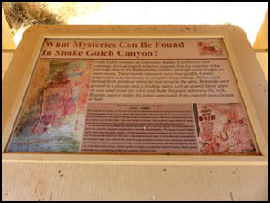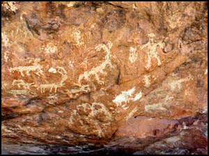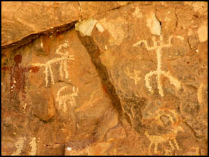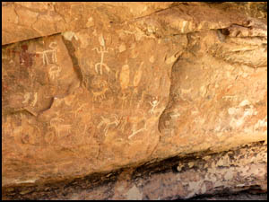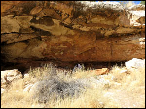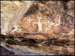 Richard and I spend the next hour walking and checking out the gulch walls for petroglyphs, but do not find any. By looking around, we accidentally got off the trail. After a little back-tracking, we get back on the trail, which goes across the stream and to an over-hang area. There are numerous petroglyphs under the over-hang area. We have indeed hit the jack pot. We take a short break here while admiring all the art work. We estimate that we have gone just over two miles. Other trip reports indicate that there are a lot more petroglyphs at the five-mile point. We don't feel like going that far, but do decide to continue ahead and around the next corner. However, we don't find any more petroglyphs at that corner, so we turn around and head back to the car. This has been a nice day hike and we didn't wear ourselves out.